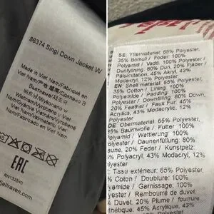• Fabric: Shell is 65% Poly, 35% Cotton/ 80% Down, 20% Feathers