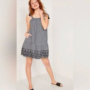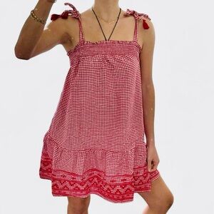 OLD NAVY Smocked Embroidered Tiered Red White Gingham Plaid Mini Dress w Pockets