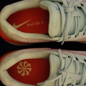 These Nike running shoes offer comfort and style with a breathable design. Featuring a light blue, vibrant yellow and orange color scheme, they're perfect for active play. Like new, excellent condition! Only worn once in doors!!!
