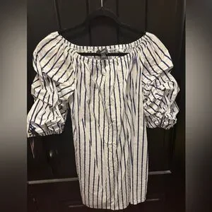 Elegant dress with blue and white stripes. Off-shoulder design with stylish puffed sleeves.