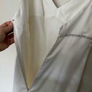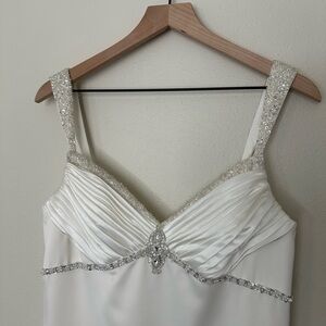 Stunning white gown with elegant silver detailing. Perfect for weddings.