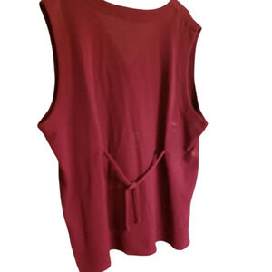Change up that boring outfit with the addition of this easy going tunic length vest or wear that too short, too tight blouse under this versatile wardrobe addition. This is my personal item and washes beautifuly and fits like a 3x. It retains its dark burgundy color and has no apparent wear that I can see. Look for it's sage green sister also for sale in my closet! hate to see them go, but I've lost weight and it doesn't work for me now.