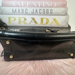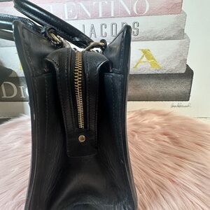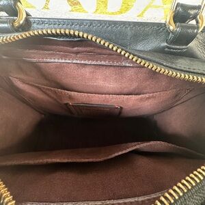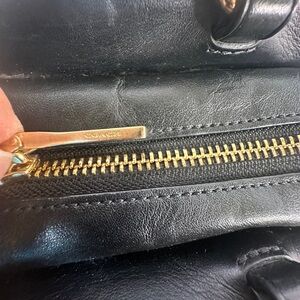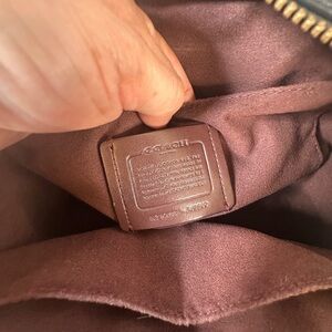 Chic black leather satchel by Coach. Features a stylish signature scarf accent. Ideal for versatile use. Coach Brown Leather Zoe Carryall