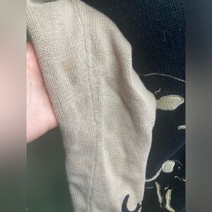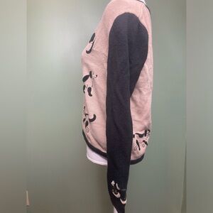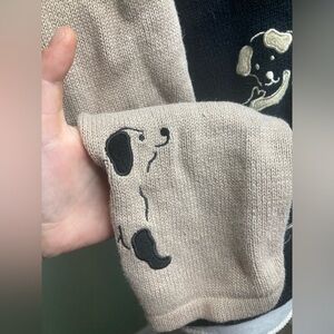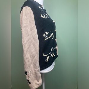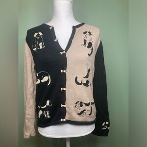 This vintage Christopher & Banks sweater from 2004 features a cute dog design with embroidered bones, perfect for any pet lover. The black sweater is a women's size medium and is made from a blend of ramie and cotton in a knit fabric. The cardigan style sweater has an animal print pattern and is a charming addition to any wardrobe for those who appreciate whimsical fashion pieces.