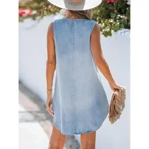 Features: This adorable mini denim dress features a V-neck, sleeveless cut, and a flowy swing hem that makes it perfect for warm days. Made of 100% cotton, it’s super comfortable and breathable, with just enough stretch for easy style. The loose fit gives a relaxed vibe that’s effortlessly stylish and versatile.