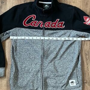 This is an awesome jacket! It's a full zip black and marled grey jacket with red Canada across the chest and Canadian leaf emblem on the sleeve. It's cozy and warm uniting the best of cabin and city in their unmistakable style. Front pockets. If you are unfamiliar with the company they were founded in Toronto, Canada in 1973, and inspired by the nearby wilderness of Algonquin Provincial Park, they inspire the world to experience everyday adventures with comfort and style.