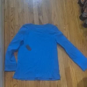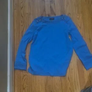 Stylish blue crewneck sweater. Features shoulder details. Perfect for casual wear.