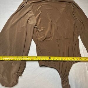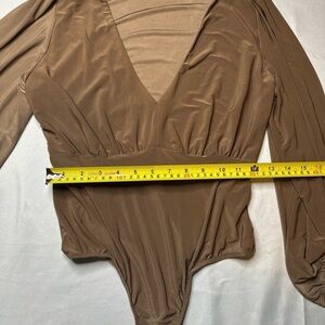 21 SAINTS Long Sleeve V-Neck Bodysuit – Brown Ruched Sleeve Minimalist Chic