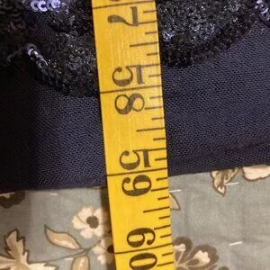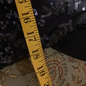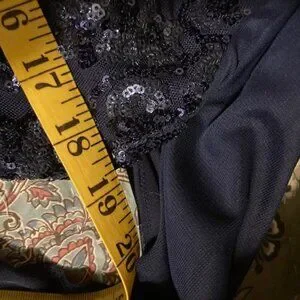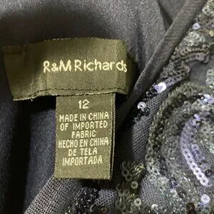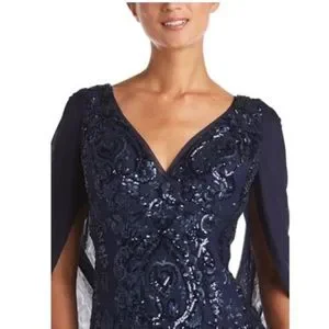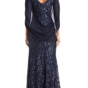 Beautiful R & M Richards special occasion dress. Zip closure; v-neck with beautiful drape in back. Navy blue with navy sequins, lined. Dress is 59" long shoulder to hem; 18.5" across the chest pit-to-pit; 18" across the front waist. Dress has some stretch to it. Elegant and has a wonderful flow. Non-smoking home. Very flattering.