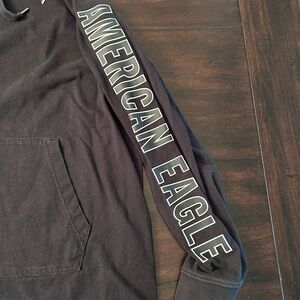Stylish black hoodie with front pocket. Features embroidered logo on chest and along the arm. Comfortable and versatile.