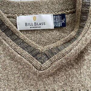 Vintage Bill Blass Tan Brown Knit Cotton Acrylic Chunky Grandpa V-Neck Sweater