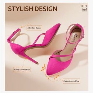 Features a striking hot pink color and a unique asymmetrical strap design. Crafted with a soft suede-like material, they offer a modern cut that elegantly exposes the sides of the foot. The medium-height heel adds a touch of sophistication, making them a standout accessory for any occasion.