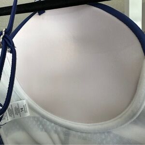 Make a splash with this chic Venus swimsuit in size 14! Designed with a flattering navy blue and white chevron pattern on the bust, accented by playful pink piping, this one-piece swimsuit combines retro vibes with a modern fit. The structured cups and adjustable straps (straight or cross) offer support and a customized fit, while the high-cut legs create a lengthening silhouette. Adorable pink button details add a nautical touch, making this swimsuit perfect for beach days or poolside lounging. Stand out in style and enjoy a comfortable, confidence-boosting fit with this eye-catching piece from Venus!