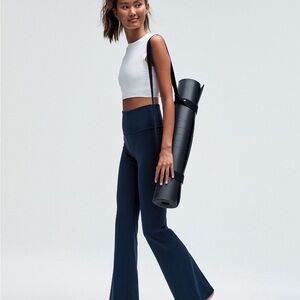 Stylish dark blue flare pants. Ideal for versatile wear. Comfortable and sleek design.