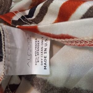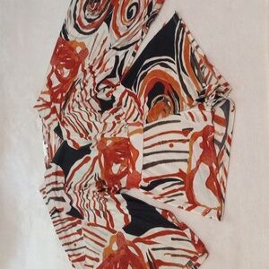 Features an all over abstract floral striped print in shades including cream, burnt orange, and black