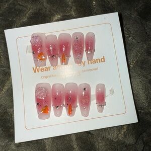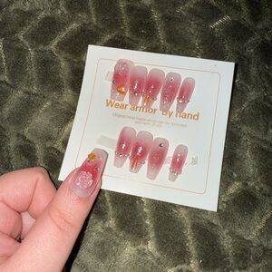 Stylish pink press-on nails with glitter and floral accents. Perfect for a chic look. Brand New! Just Made! Get a salon ready luxe manicure without spending hundreds of dollars or hours at the salon, be ready in 5 minutes or less! Support a small business and know your support goes towards paying for college!