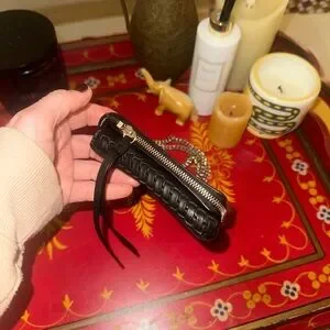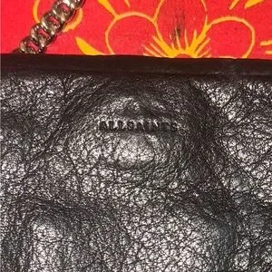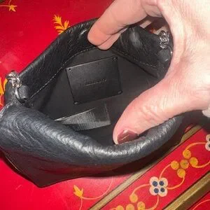 Chic black leather crossbody by All Saints. Features a sleek design with a silver chain strap. Perfect for versatile styling.