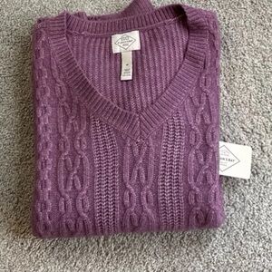 This is a new with tag St John’s Bay Medium sweater beautiful Bordeaux Rose mixed Cable Stitch V neck Sweater pictures are showing the sweater in a darker shade this is about 3 shades lighter more like lilac Perfect Gift for Christmas