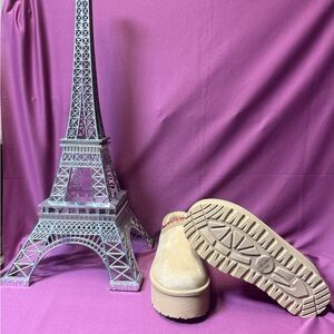 Stylish cream mules with a bold red trim. Features a comfortable platform sole. Ideal for casual outings.