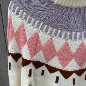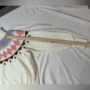 Elevate your wardrobe with this elegant cream sweater, featuring stylish pink and purple patterns. Perfect for a cozy and fashionable look.
