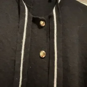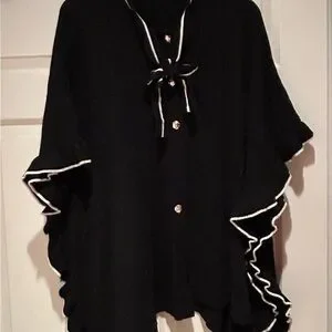 Versatile DraperJames knit poncho/cape. Black with white trim and gold buttons. Cute front tie at neck. Can be worn over another top, or alone. Makes a nice addition to dresses in colder weather.