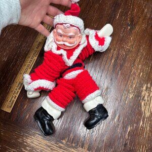 This vintage Santa Claus doll features a hand-crocheted outfit with a plastic molded face and boots. A collectible piece reflecting festive nostalgia.