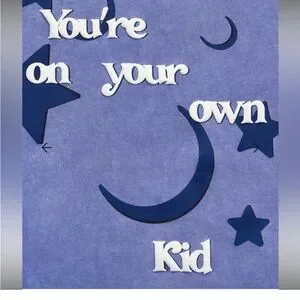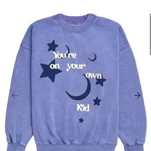 Purple/blue sweatshirt with star and moon graphics. Features the text 'You're on your own kid.' New from the holiday drop! XS fit me but I liked the S better!