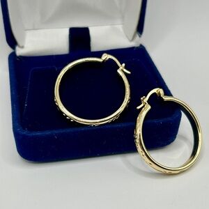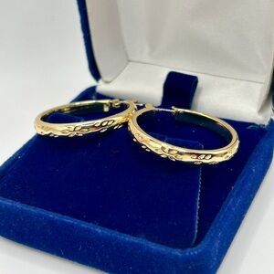 New and stylish, these floral 12k gold plated embossed hoop earrings add a touch of elegance to any ensemble. 1.25” wide hoops x 4mm width embossed area. These beauties are not stamped and have been tested with the scratch stone acid test, positive results at over 12k. Beautiful and perfect for any occasion.