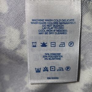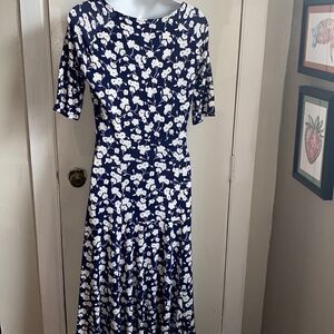 Washable viscose, polyester, elastane blend in a navy blue with white floral pattern, crew neck, seam at the waist, slight flare midi skirt, elbow length sleeves. Excellent condition. Size XS, measures 16” from armpit to armpit, 14” across waist and 46” long from top of shoulder to bottom hem.