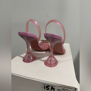 Pink PVC slingback pumps from Amina Muaddi. The Begum sling pump is the designer's signature style. It is made from pink pvc mounted on a 95mm sculptural "Martini"heel, an elegantly pointed toe complete with a crystal-embellished buckle at the front.