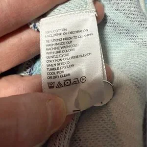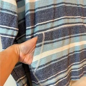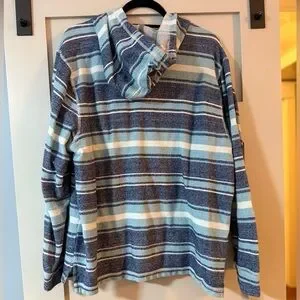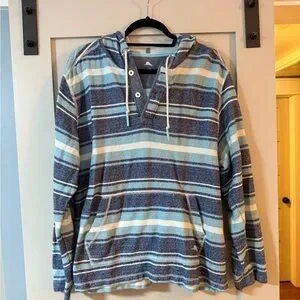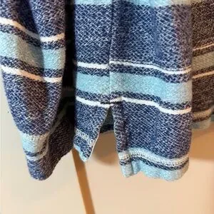 Stylish hoodie with blue and white stripes. Features a drawstring hood and button details. Excellent condition