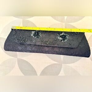 Add timeless sophistication to your evening look with this stunning Lord & Taylor clutch. Featuring intricate black lace overlay and shimmering black and silver beaded floral embellishments, this piece is a showstopper. Perfect for weddings, formal events, or a chic night out.