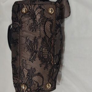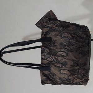 Very feminine Valentino Garavani black bag. Perfect for wedding, graduation, or nightout! Black lace over cream/tan body, with cute bow on diagonal. Gold hardware. Interior lined in satin with 1 zip and 2 open pockets. Zipper top closure. Very good condition. Will include a dust bag.