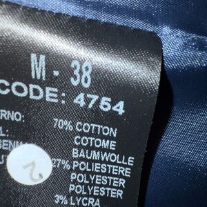 Monogramed navy blazer. Blue fabric label with detailed material composition. Includes cotton, polyester, and lycra. Shoulder 15”, sleeve 24 1/2” two pockets. This blazer was purchased from poshmark but sold as a man’s blazer but when received it said women’s. Not sure but measurements are above. It seems for more of a smaller frame person. Made well never worn, I great condition.