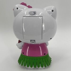 Hello Kitty Hawaiian ukulele musical animated figure dancing hula tropical character. This charming figure features Hello Kitty dressed in a vibrant pink top, a green hula skirt, and a floral lei. She holds a reddish-brown ukulele and a pink flower adorns her head. The back of the figure has a battery compartment and an on/off switch. Ideal for collectors, fans of Sanrio characters, or as a fun desk accessory for a tropical-themed workspace. Good pre-owned condition, see photos for details. Item works.