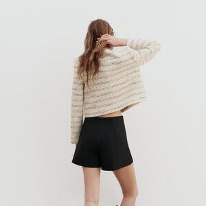 Elegant cream tweed blazer with black accents. Features round neckline and button closure. Perfect for formal occasions.