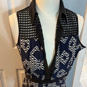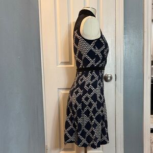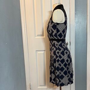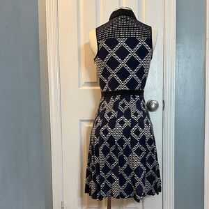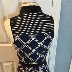 Stylish mini dress with a bold geometric pattern. Sleeveless and perfect for any event. Pre-owned in good condition see photos. Colors are black, navy blue and off white. Buttons up from waistline and zips up on the left side of dress.