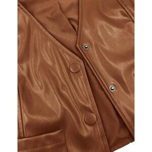 Features: Made from faux leather with a deep V-neckline, front button closures, and a cropped, fitted silhouette. It also has two stylish front patch pockets, making it a trendy piece for street style or casual days.