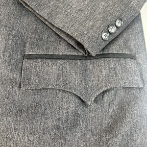 Design details: Two-button front closure, notched lapels, single back vent, western-style front and back yoke with vertical piping details, flap front pockets with scalloped western styling, three-button cuffs, full black lining.