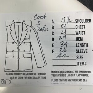 Actual Measurements (per measurement card): Shoulder 17.5 in, Chest 21 in, Waist 21 in, Hem 24 in, Length 34 in, Sleeve 26 in.
