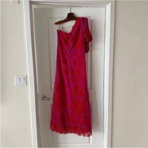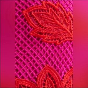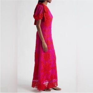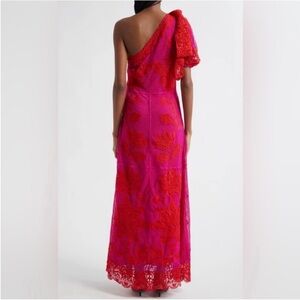 Embrace vibrant elegance with the Guipuire bicolor maxi dress one shoulder. Its captivating bicolor guipure lace weaves a tale of daring red and lively pink, creating a stunning contrast. The asymmetrical one-shoulder silhouette, adorned with enchanting floral patterns, offers a touch of playful sophistication. Finished with a delicate puff sleeve and an intricate, flowing hemline, this dress promises to turn every moment into a celebration of style.