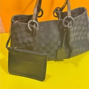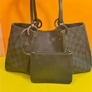 Stylish Gucci tote with iconic monogram. Includes matching pouch. Perfect for daily use.