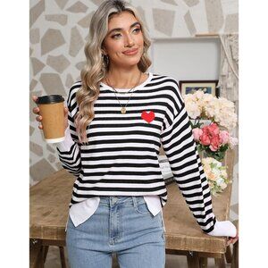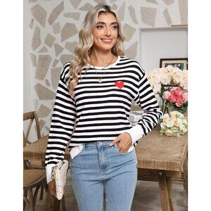 Features: Soft, warm crew neck sweater with long sleeves and a charming red heart pattern on the chest. The classic stripe design adds a playful touch, perfect for casual wear. Easy to pull on and comfy for everyday style.