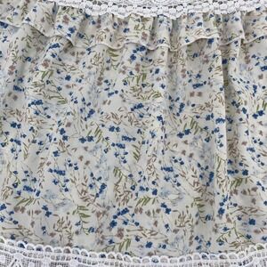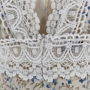 Eilly Bazar Romantic prairie–inspired maxi dress with a soft coastal feel. Cream base with delicate blue floral print, finished with intricate white lace trim throughout. Features a flattering deep V neckline, defined waist, and tiered ruffle hem for graceful movement.