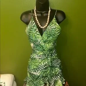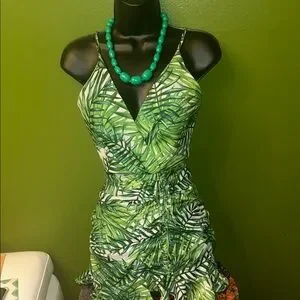 Tropical leaf print dress. V-neckline with adjustable straps. Ruched sides with ruffle hem. Perfect for summer outings.