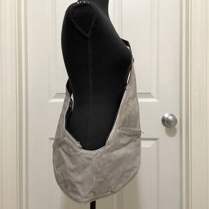 Sash genuine leather reversible crossbody sling bag in black and a gray/beige color (greige). This unique bag features a curved silhouette and a single adjustable shoulder strap with snap closures. The main compartments are secured with a zipper and open to reveal a lined interior with multiple card slots and pockets. The exterior showcases clean lines with minimalist detailing. Perfect for everyday errands or a stylish evening out. This is a soft, lightweight leather making it comfortable for all day wear. The bag has two small spots on the gray side, other than that it is in excellent preowned condition.