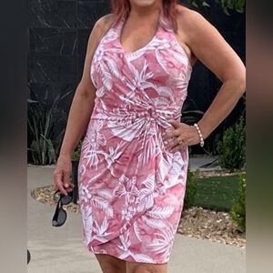 Embrace elegance with this stunning pink floral halter dress. Perfect for any occasion, it features a beautiful floral pattern that adds a touch of sophistication.