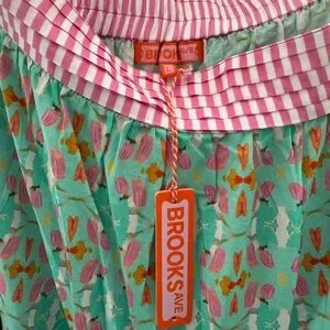 Elevate your wardrobe with the Brooks Avenue Multicolor Maxi Skirt. This vibrant piece features a stunning blend of pink, green, and yellow hues, perfect for making a statement. Enjoy the comfortable fit and eye-catching design for any occasion. Skirt has side zip with elastic waist in back. Front waistband has pleated detail. Flat waist measurement is 16 inches and is adorable pink and white stripe. Length is 39 inches. Side seam pockets. Skirt comes with original matching drawstring bag.