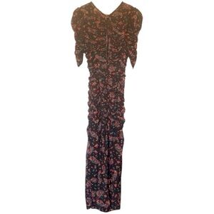 Beautiful Free People midi dress with vibrant floral pattern. Features ruched puffed sleeves, high front off-center slit, cute three button closure at the back with keyhole details. Such a stunning dress!