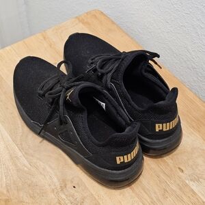 Stylish black sneakers featuring a gold Puma logo. Perfect for casual wear.